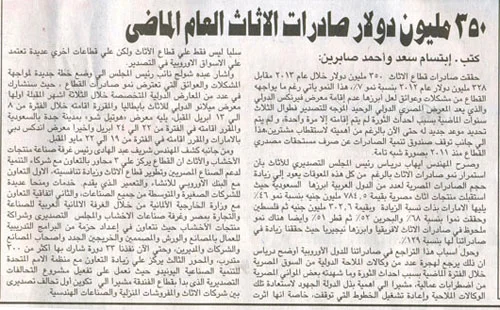 "350 مليون دولار صادرات الاثاث العام الماضي" September 11, 2014 / Administrator View fullsize 0 Likes