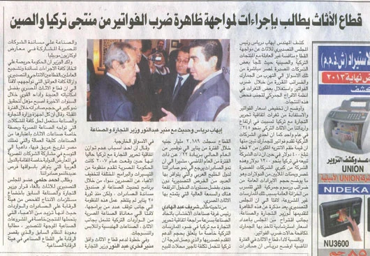 قطاع الأثاث يطالب باجراءات لمواجهة ظاهرة ضرب الفواتير من منتجي تركيا والصين September 11, 2014 / Administrator View fullsize 0 Likes