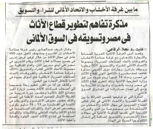 مذكرة تفاهم لتطوير قطاع الاثاث في مصر وتسويقه في السوق الالماني September 11, 2014 / Administrator View fullsize 0 Likes