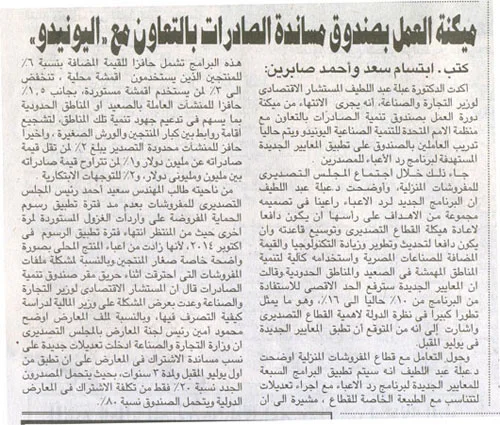 ميكنة العمل بصندوق مساندة الصادرات بالتعاون مع اليونيدو September 11, 2014 / Administrator View fullsize 0 Likes