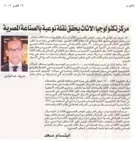 مركز تكنولوجيا الاثاث يحقق نقلة نوعية بالصناعة المصرية September 08, 2014 / Administrator View fullsize 0 Likes