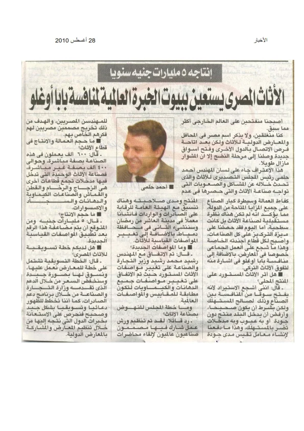 الأثاث المصري يستعين ببيوت الخبرة العالمية لمنافسة بابا اوغلو September 08, 2014 / Administrator View fullsize 0 Likes